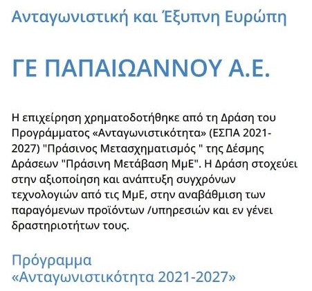 Η Επιχείρηση χρηματοδοτήθηκε απο τη Δράση του Προγράμματος <<Ανταγωνιστικότητα>> (ΕΣΠΑ 2021-2027) “Πράσινος Μετασχηματισμός” της Δέσμης Δράσεων “Πράσινη Μετάβαση Μμε”. Η Δράση στοχεύει στην αξιοποίηση και ανάπτυξη σύγχρονων τεχνολογιών απο τις Μμε, στην αναβάθμιση των παραγόμενων προϊόντων/υπηρεσιών και εν γένει δραστηριοτήτων τους.